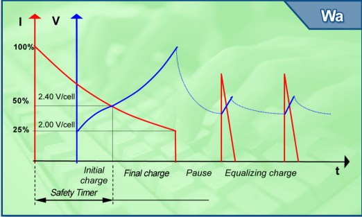- 以递减电流充电到达2.4伏/单体(可调)后,最终充电阶段开始