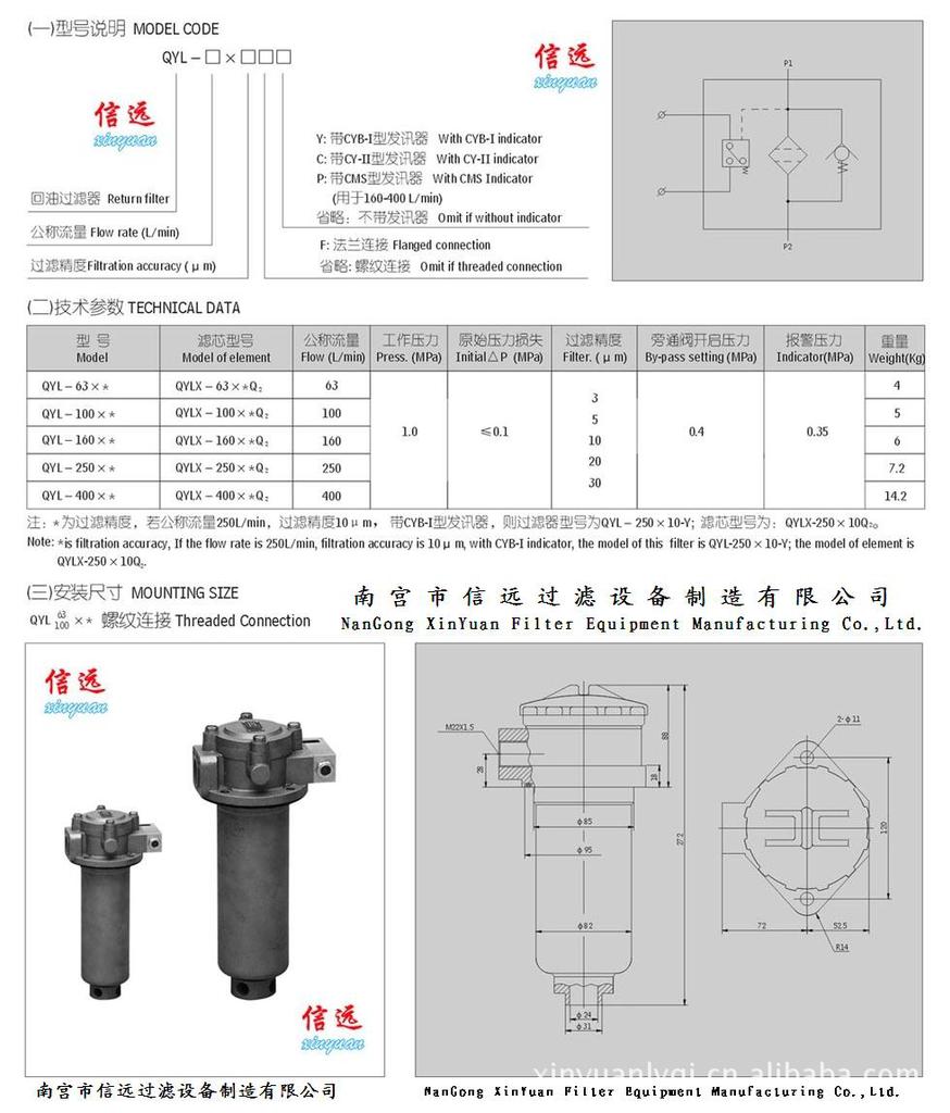 南宫市信远过滤设备制造有限公司(原南宫市信远滤器制造厂)主要生产:滤芯,滤清器,滤油器,过滤器,滤油机,回油过滤器,吸油过滤器,高低压过滤器,国标滤芯代替产品,代替黎明滤芯,代替贺德克滤芯等,同时生产非标产品:高,中,低压滤芯,滤油机滤芯,滤油器滤芯,船舶滤油机滤芯,大流量回油过滤器及滤芯,精密过滤器,耐高温不锈钢液压油滤芯,粗过滤芯,精过滤芯,反冲洗滤芯,聚结分离滤芯,不锈钢折叠滤芯,玻璃纤维折叠滤芯,烧结滤芯,聚结分离滤芯,天然气管道滤芯,煤气过滤器滤芯,氢气管道滤芯,气水分离器滤芯,油水分离器滤芯,油气分离器滤芯,工业用过滤蜡滤芯,网式过滤器芯等设备液压油滤芯、过滤器。
