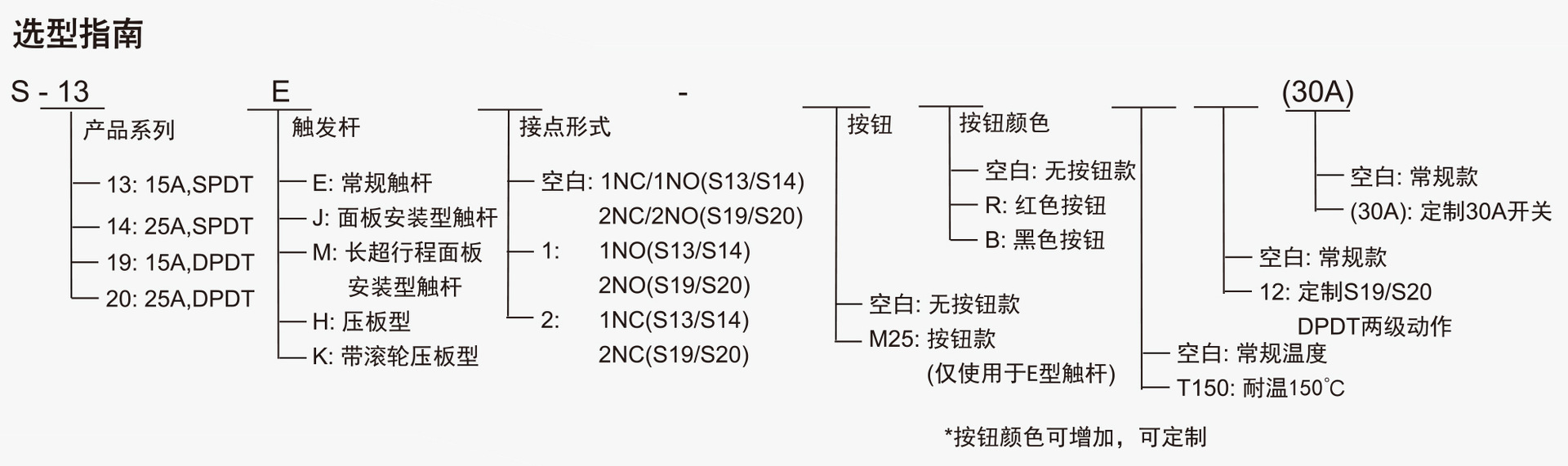 众多不同的触发头、3种触点形式:SPDT 1NO1NC(单刀双掷1常开1常闭),SPST 1NO(单刀单掷1常开),SPST 1NC(单刀单掷1常闭)、超长寿命弹簧动作机构、根据客户需要可150℃使用开关(仅限于部分型号,请与SUNS联系)、可选30A超大电流