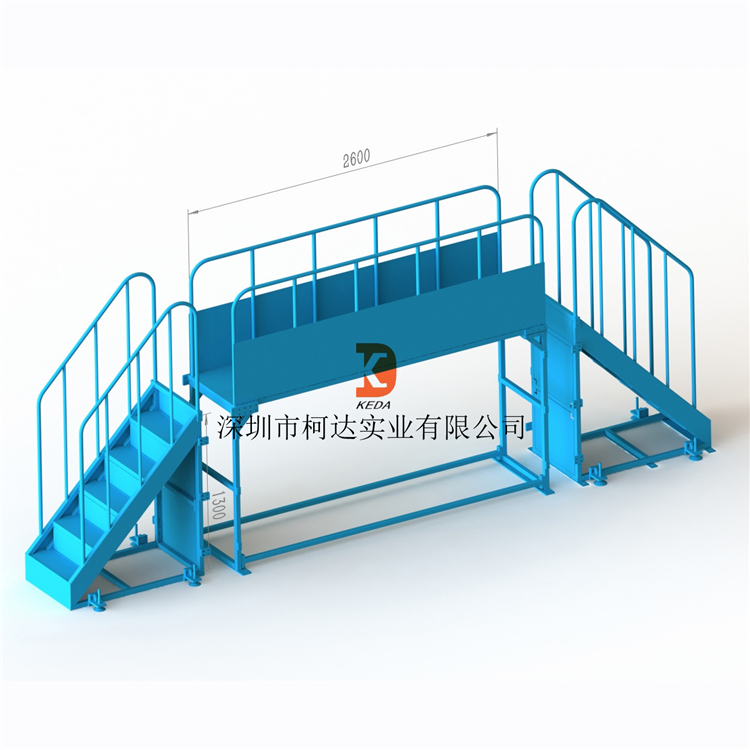 答:柯达实业跨线梯整体材质使用Q235制作,俗称铁制;柯达实业跨线梯框架才有40*40*2.5铁方通,扶手φ30*1.5圆管折弯而成,过道及楼梯踏步采用2.0防滑花纹板,梯子整体采用喷塑烤漆处理。