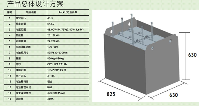 电池组为配套林德叉车使用,采用CATL 1P5S 271AH模组共5个,3个模组串联,组成2个15S模组,最终合成一个15S 542AH电池组。