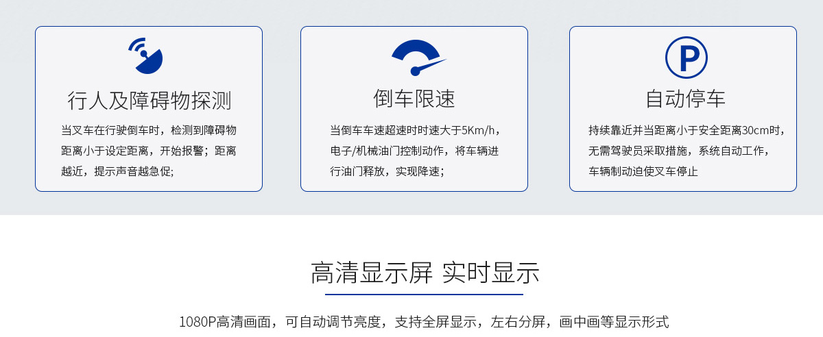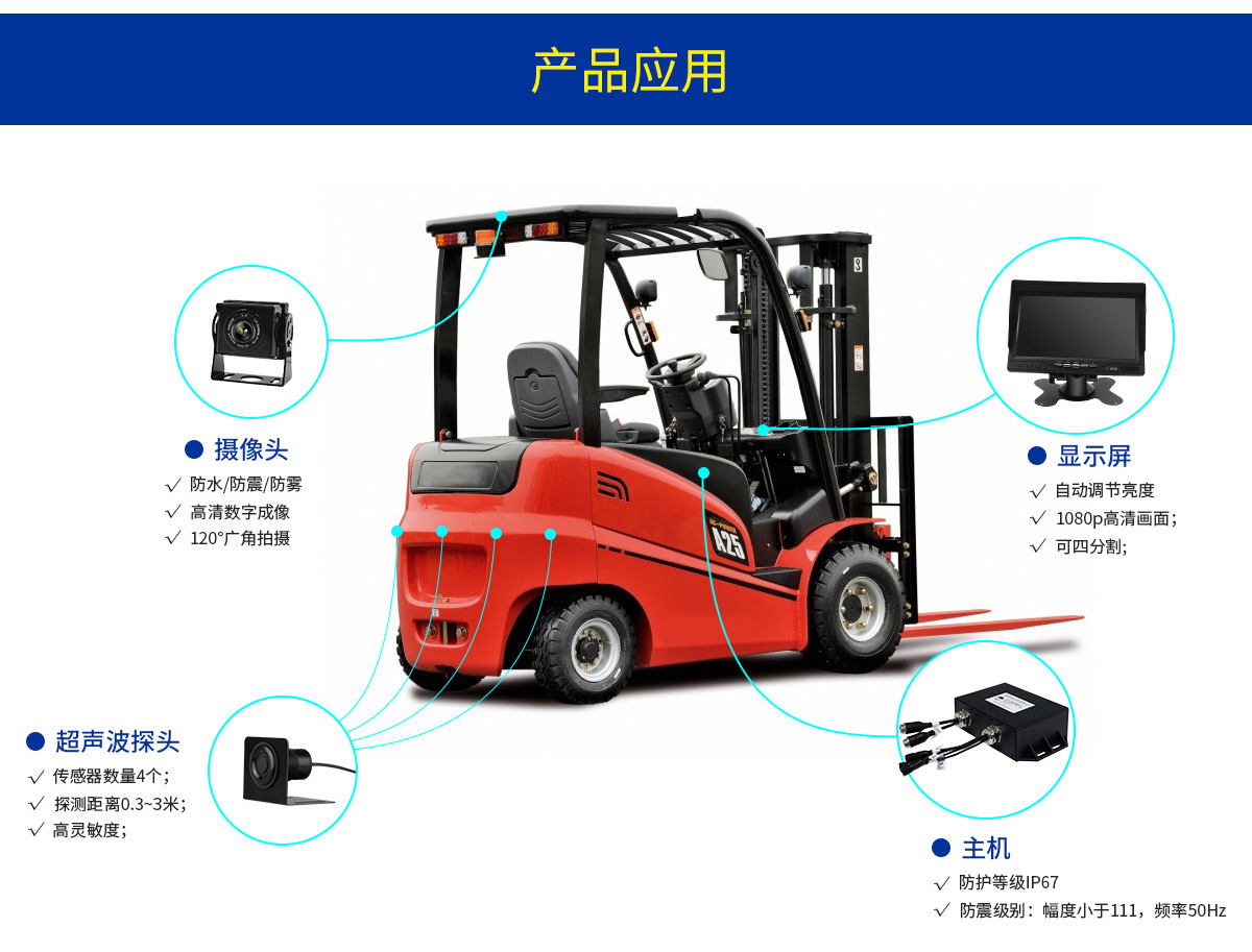 雷达防撞预警&影像系统可帮助你避免在叉车倒车过程中,因视觉盲区,导致倒车时撞人、撞物等事故,提高工作效率和安全性,该系统实时探测目标距离,可为操作人员提供视觉和听觉警报,以避免潜在危险并使他们能够提前采取适当行动。
