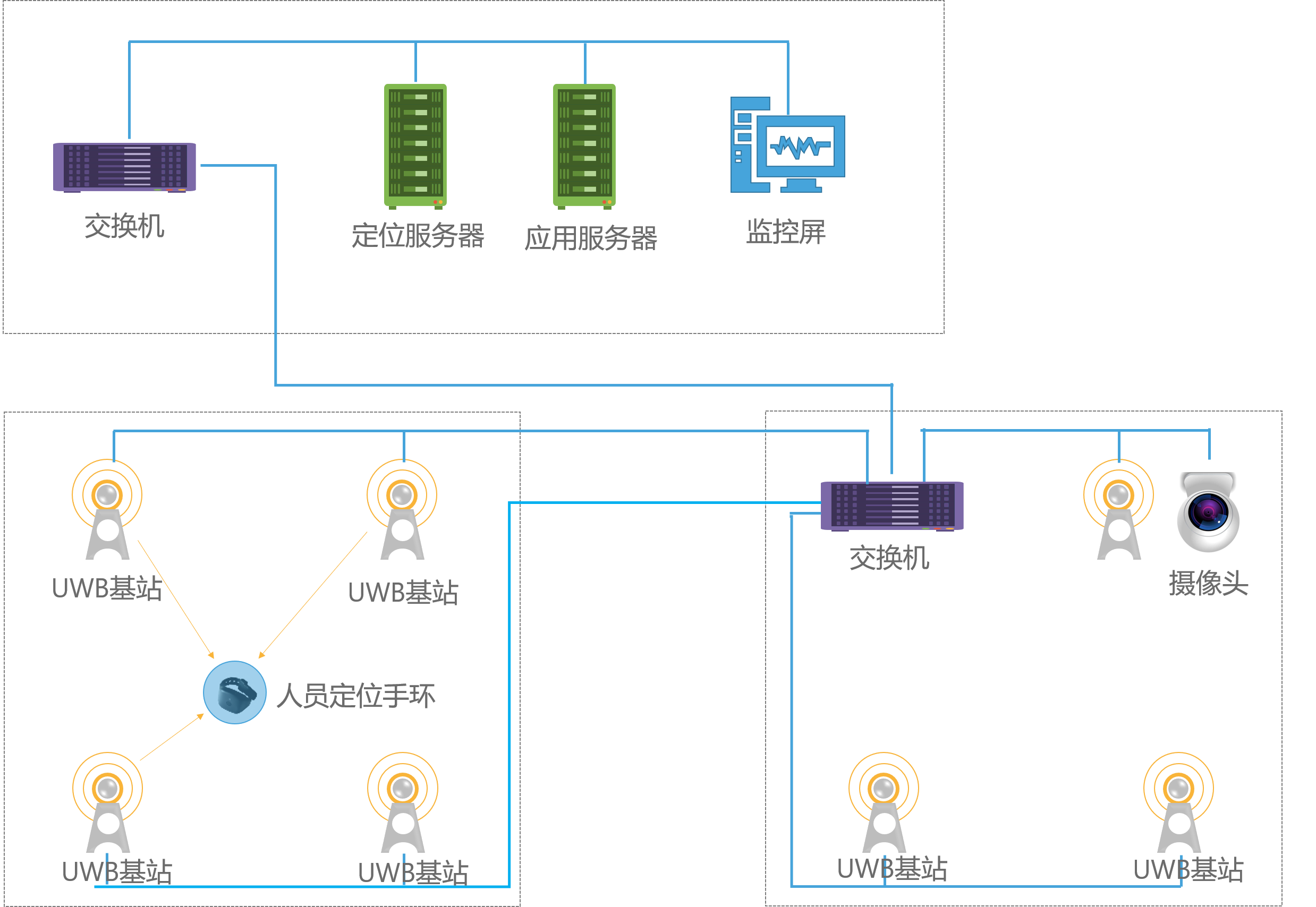 UWB定位技术是基于三点定位的原则,所以要获取高的精度要求在定位的空间内要部署三个基站,在三个基站所囊括的空间内部具有最高的定位精度。在定位的空间内如果有明显的障碍物如果对基站的信号有阻挡的也对精度有一定的影响。被定位的人员需要携带定位的TAG或者手环之类的定位终端。基站之间的组网可以采用有线网络或者WIFI网络的模式,通过基站的IP设置来实现系统组网。