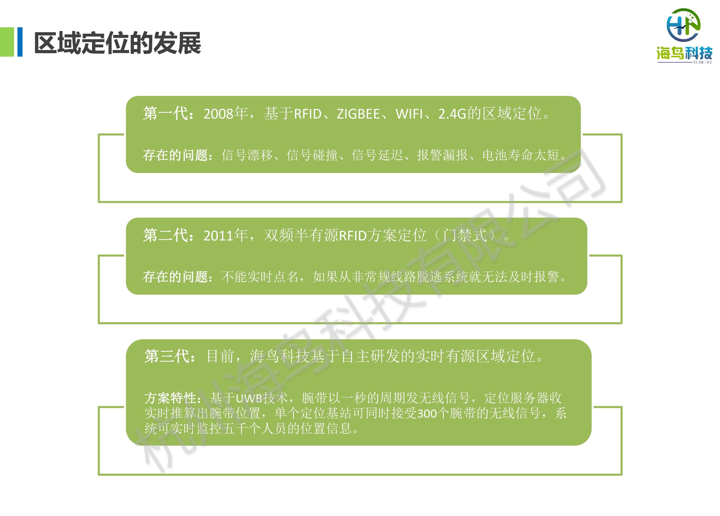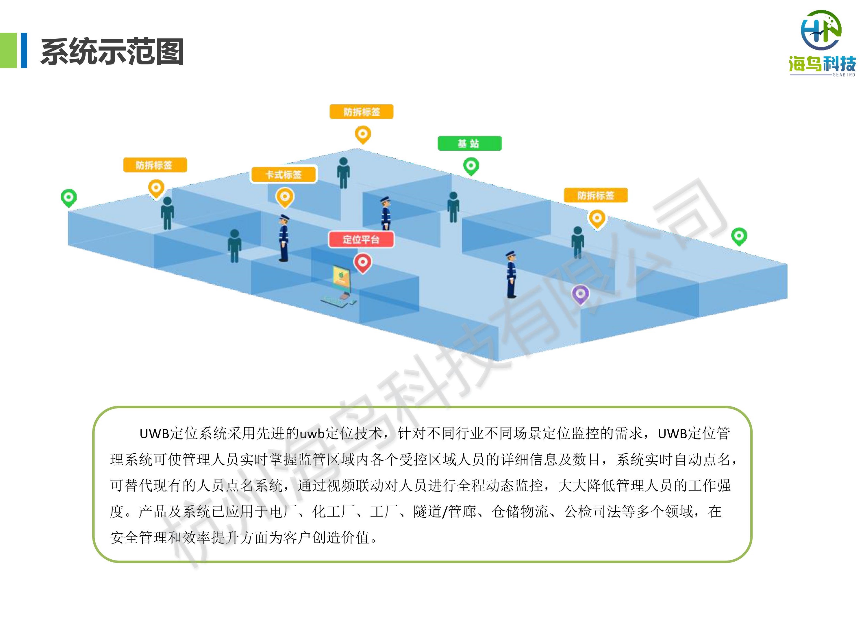 海鸟科技UWB定位系统依托基于UWB技术,自主研发的通讯协议的实时有源区域定位应用技术,整合了传感器技术、现代网络与无线通信技术、嵌入式计算技术、分布式信息处理技术、分布式软件和大数据处理等技术,通过科技创新,成功研发了智慧监管定位系统。系统使用安全可靠的方式实时识别、追踪、监管相关人员,实现个人、车辆及物品动态实时追踪和告警,具有自动身份识别、位置跟踪和定位、事件预警和自动报警等功能,从根本上改变事后追溯的被动监管模式,进行主动监管、高效监管、智慧监管,真正实现管理的信息化、智能化、规范化。