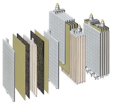 HAWKERPZS牵引型蓄电池使用了成熟的管式正极板技术。正极板采用压铸型板栅,活性物质储存在采用聚酯材料的排管中;负极板使用加强型板式极板。正负极板之间是多微孔、一侧带有凸起的隔膜。电池单体外壳采用高抗冲击且耐高温的聚丙烯材料,壳盖采用热封工艺以防止电解液的泄漏。