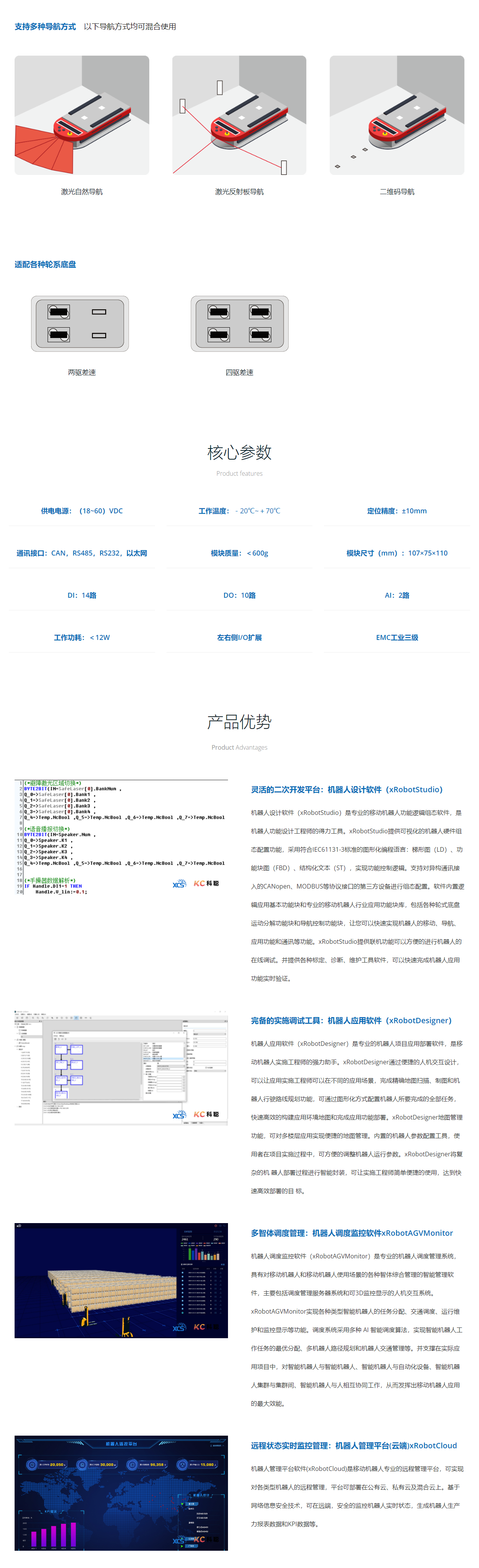 移动机器人自主导航控制器MRC3000,是一款全自主知识产品的移动机器人领域专业控制器产品,特别适用于轻载搬运机器人。MRC3000具有高性能、高集成度、高可靠性等特点,MRC3000内置自然导航、激光导航、二维码导航算法,支持多型号常用国内外导航传感器,内置支持两轮差速、四轮差速和麦克纳姆轮式底盘运动功能块。MRC3000自带丰富的DI、DO、AI、编码器信号接口资源和RS232、RS485、10/100M工业以太网通讯接口。不仅支持CANOpen和Modbus等标准通讯协议,还支持采用非标的自定义串行和以太网通讯协议。使用者可通过图形化二次开发平台(符合IEC 6-1131/3标准),进行机器人各项功能逻辑的实现。