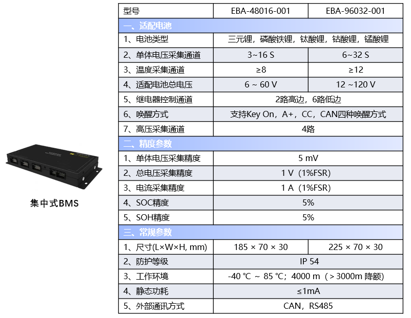 EBA系列集中式BMS,是集采样与主控功能于一体的BMS产品,满足12 ~120V动力电池系统需求,可广泛应用于工程机械与储能。