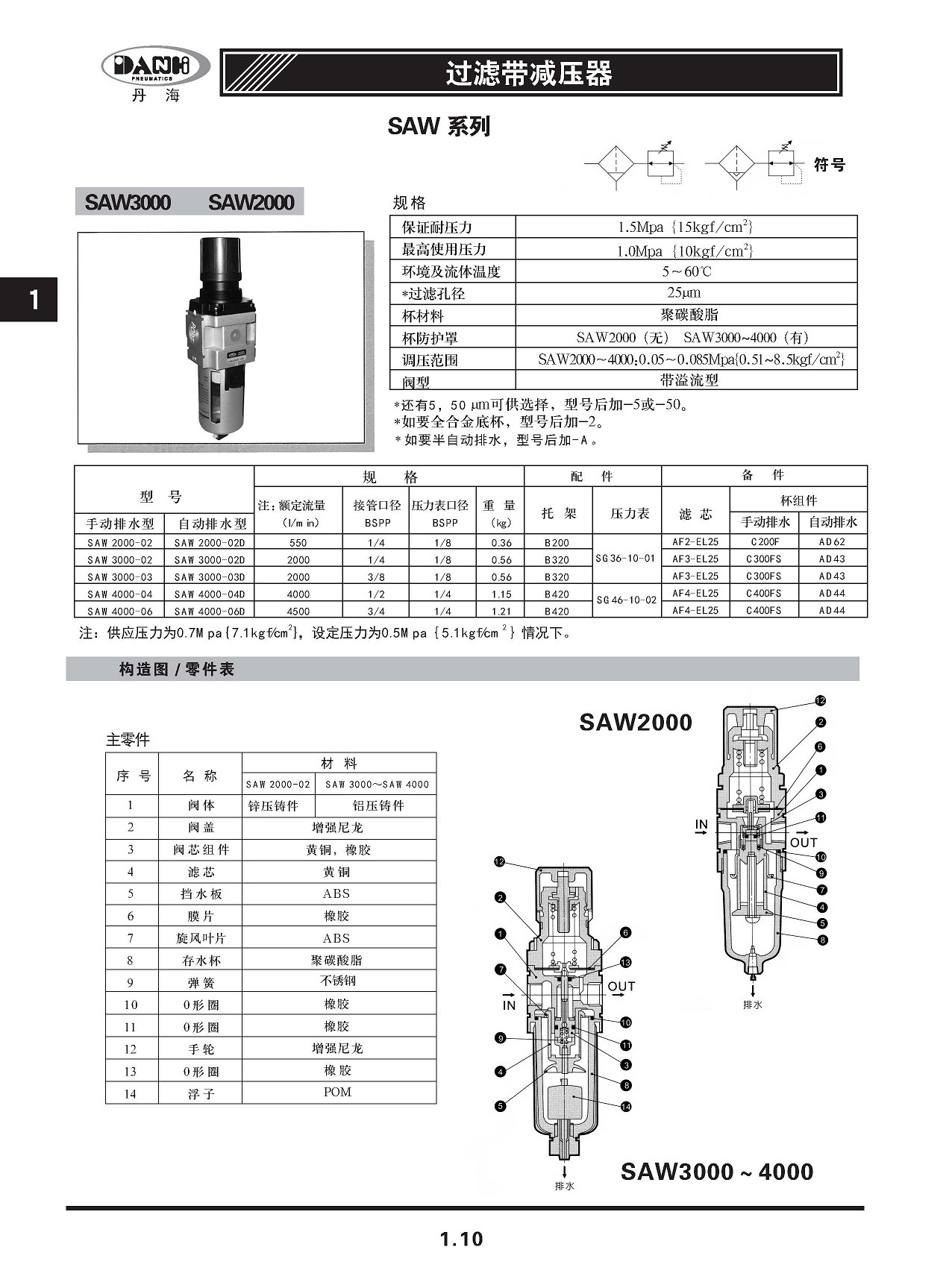 韩国DANHI丹海SAW系列过滤器带减压阀,气源处理过滤减压阀,单联件,单联过滤,单杯调压过滤,调压过滤组合,空气减压阀油水分离器,滤水调压阀,滤水减压阀,空气过滤组合、三联件、二联件、过滤器、空气过滤器、自动排水器,自动排水过滤器,手动排水过滤器,半自动过滤器,减压阀、调压阀、过滤减压阀、过滤调压阀、减压过滤器、调压过滤器、油雾器:SAW2000-02,SAW3000-02,SAW3000-03,SAW4000-04,SAW4000-06,SAW2000-02D,SAW3000-02D,SAW3000-03D,SAW4000-04D,SAW4000-06D,B220,B320,B420,AF2-EL25,AF3-EL25,AF4-EL25,C200F,C300FS,C400FS,AD62,AD43,AD44。