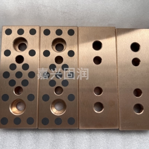铜+石墨导滑板,也称为石墨镶嵌铜滑板(Graphite-Inserted Copper Slide Plate),是嘉兴固润生产的一种高性能的滑动轴承组件,广泛应用于需要优良耐磨性、自润滑性和导热性的机械设备中。这种滑板的设计结合了铜合金的高强度和耐腐蚀性,以及固体润滑材料(如石墨、二硫化钼(MoS2)等)的自润滑特性。