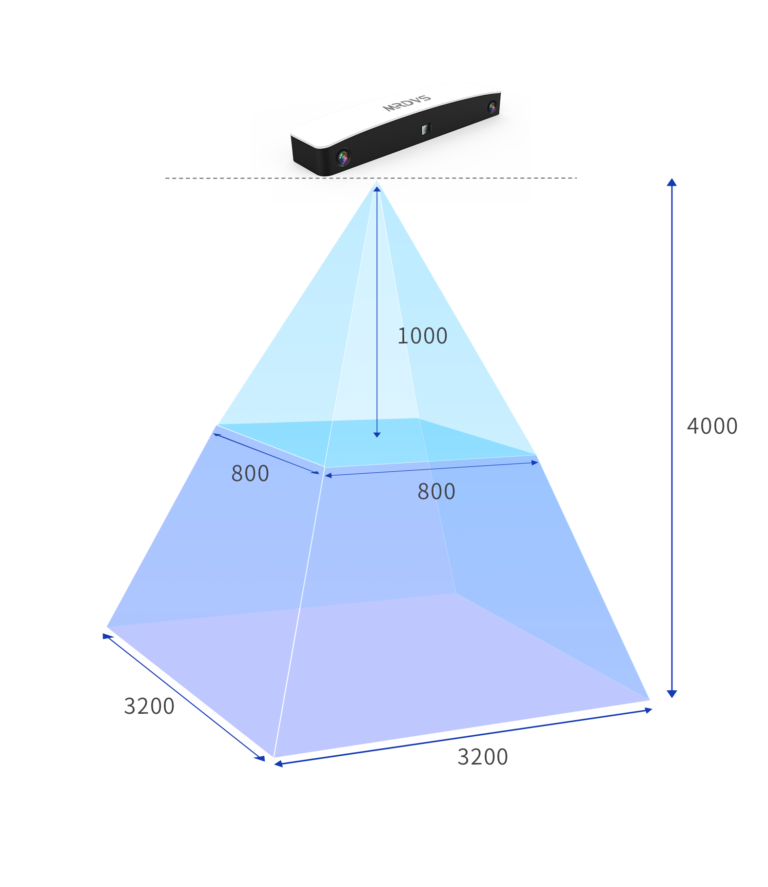 H3240基于MEMS的结构光技术开发,可实现1.5m×1.6m×1.8m的大视野3D信息获取。通过智能AI算法对多种袋包垛形高清成像和三维重建计算抓取中心,专为机械臂完成拆/码垛作业设计。